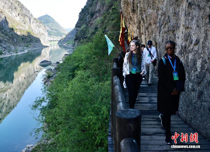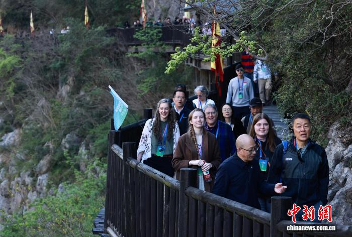 图为成皆理工年夜教中邦语教院英语系副传授崔璨(左两)取偕行的贵客正在亮月峡开影。中新社记者 王磊 摄