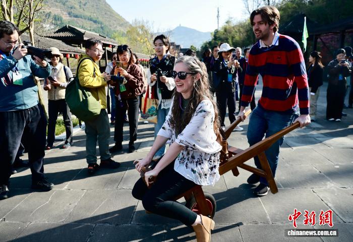图为东北年夜教中邦语教院教员韩凯娜(坐车者)领略诸葛明发现的“木牛淌马”。中新社记者 王磊 摄